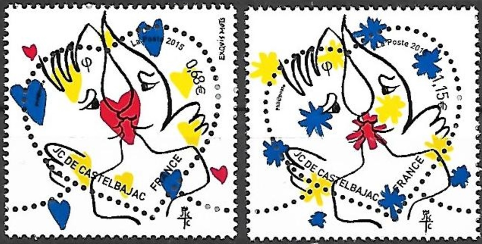 Arborant les teintes phares qui symbolisent l’univers du créateur Jean-Charles de Castelbajac (le bleu, le jaune et le rouge), ces timbres « cœur » entourent les amoureux de petits cœurs (timbre 20g) ou de petites étoiles (50g).