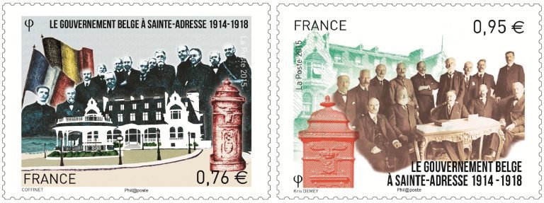 En août 1914, la Belgique est envahie par les troupes allemandes. Malgré des combats acharnés, le repli est inévitable, la garnison bloquée dans Anvers abandonne le combat. Le 10 octobre de la même année, le gouvernement belge demande l’hospitalité à la France. La ville de Sainte Adresse est choisie car, proche du port du Havre, le « Nice havrais » présentant de vastes bâtiments luxueux et des villas récemment construites par Dufayel, pourra accueillir et loger le gouvernement et les ministères belges. L’Hôtellerie Normande, ici représentée sur le timbre à 0,76 €, sert essentiellement de résidence commune pour les ministres. La petite ville de Sainte Adresse est ainsi transformée en véritable siège des autorités belges avec une intendance et une logistique capable de restituer une maîtrise des affaires courantes de la Belgique envahie.