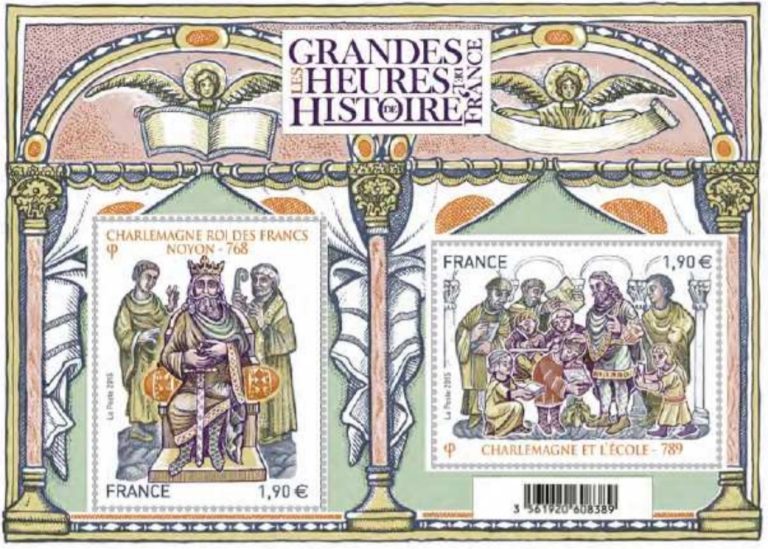 La Poste rend hommage à Charlemagne, avec l’émission d’un bloc de 2 timbres : Le premier timbre « Charlemagne, roi des Francs, Noyon – 768 » illustre le couronnement de Charlemagne à Noyon. Le deuxième timbre « Charlemagne et l’école – 789 » illustre l’utilisation de l’écrit comme moyen de diffusion de la connaissance.