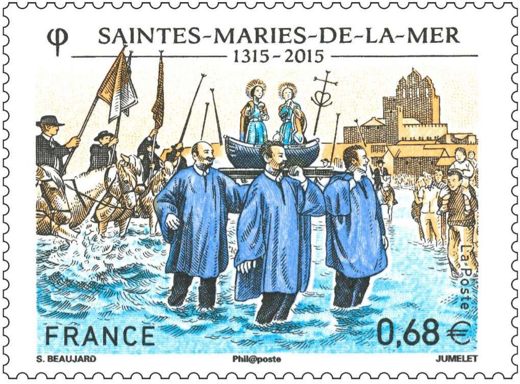 La confrérie des Saintes Maries de la Mer fondée en 1315 reçoit pour mission d’apporter son soutien aux personnes en difficulté et son aide aux autorités religieuses dans l’organisation des pèlerinages. Lors des processions à la mer, la barque des saintes femmes est portée sur les épaules par les membres de la confrérie, escortée par les gardians et entourée par la population. C’est cette procession qui est ici représentée sur le timbre poste.