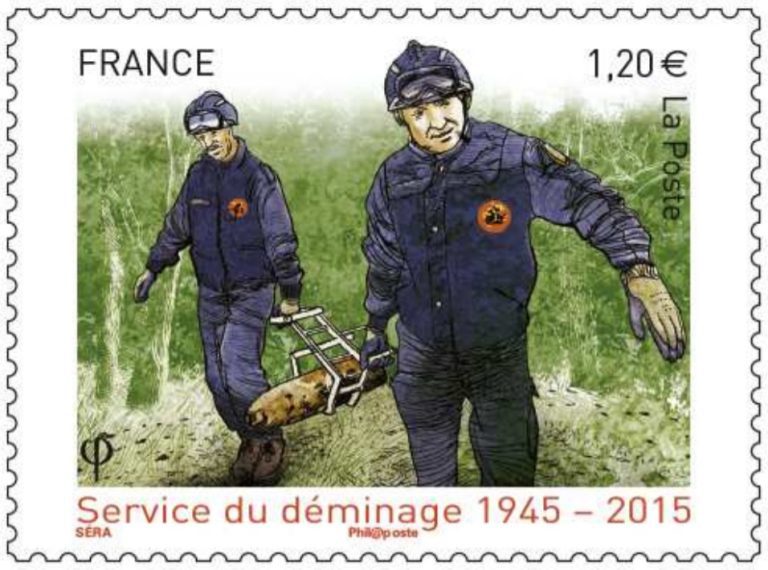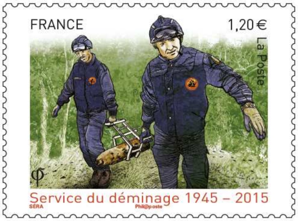 Le timbre illustre le quotidien des démineurs, dont la devise est « réussir ou périr« , lors d’une opération de désobusage.