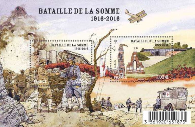 L’artiste Damien Cuvillier propose sur un même bloc plusieurs scènes pour illustrer la bataille de la Somme : la rencontre de 2 soldats français et anglais au premier plan ; les secours organisés par la Croix-Rouge ; l’explosion d’un obus ; un biplan français Nieuport 17 en vol.