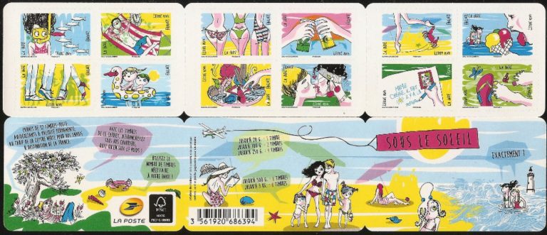 Les timbres de ce carnet sont illustrés par des créations originales de Corinne Salvi et Joëlle Gagliardini, conjointement. Elles ont donné une vision féminine des vacances, avec une bonne humeur tonique, de l’humour. Les timbres et la couverture du carnet sont colorés et dégagent une lumière d’été, telle que nous la rêvons, avec de la détente, des plaisirs simples et des belles rencontres.