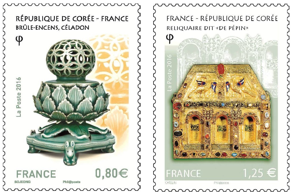 Pour commémorer les 130 ans de relations diplomatiques entre la France et la Corée du Sud, et dans le cadre de l’année France-Corée, une émission commune est organisée sur le thème des artisanats d’art parmi les plus emblématiques de nos 2 pays, la céramique pour la Corée, l’orfèvrerie pour la France. Pour la Corée, le timbre présente un brûle-encens, pièce en céladon du royaume Goryeo (ou Koryo) datant du XIIème siècle conservé au musée national de Corée à Séoul. Pour la France, c’est le reliquaire dit « de Pépin » issu du Trésor de l’abbaye Sainte Foy de Conques qui a été choisi pour le timbre.