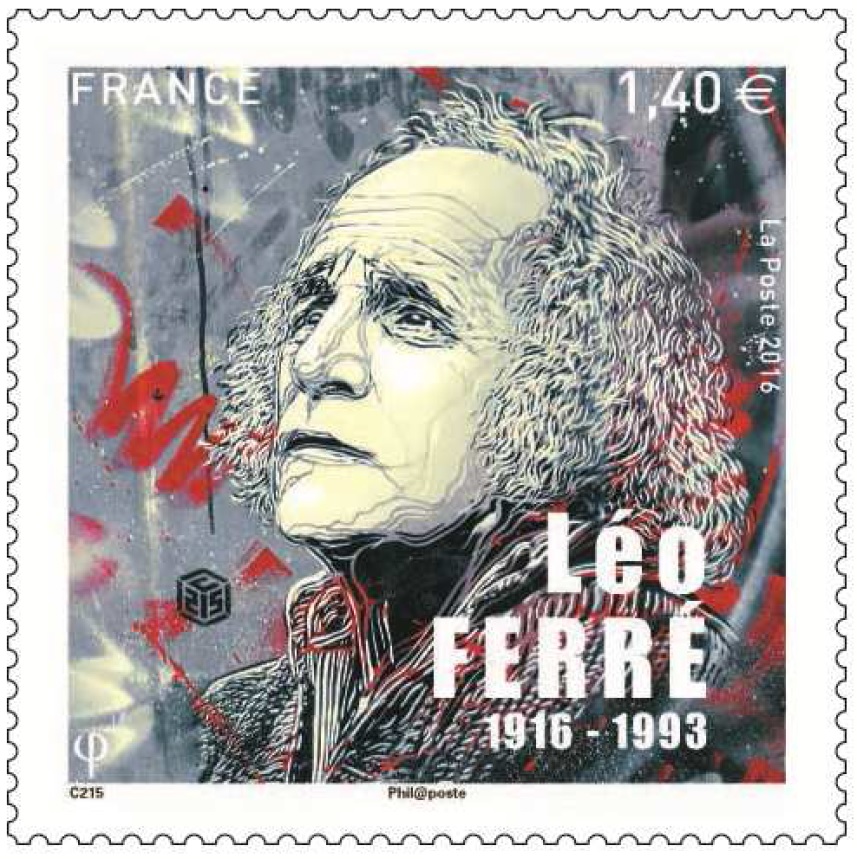 La Poste a fait appel à C215 pour concevoir ce portrait emblématique. Ce dessin réalisé au pochoir, symbole de liberté et de poésie dans les couleurs noir blanc et rouge, qui rappellent celles de l’anarchie, ce courant de pensée qui a toujours inspiré l’oeuvre de Léo Ferré.