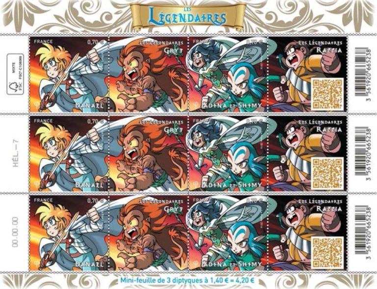 La Poste édite des timbres mettant à l’honneur les héros de la manga ’Les Légendaires’ créée par Patrick Sobral et éditée par Delcourt, dont le 19ème tome paraîtra en octobre. Ces timbres BD sont les 1ers d’une nouvelle série de timbres Jeunesse lancée par La Poste pour cette rentrée. Ces 4 visuels dont 2 timbres, sont une création originale de Patrick Sobral, représentant ses héros Danaël, Gryf, Jadina, Shimy, et Razzia. Un QR code permet de visionner un cours de dessin proposé par Patrick Sobral ainsi que des extraits de BD et une vidéo animée présentant les personnages.