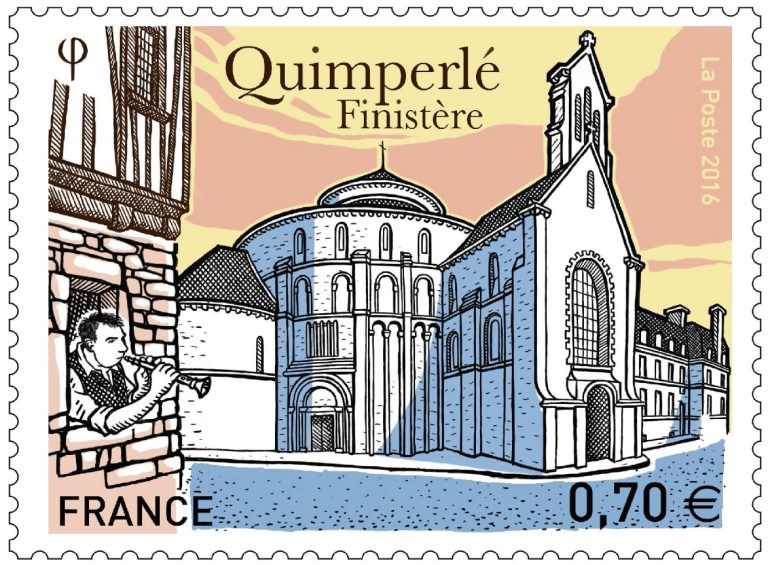 Nichée entre les rivières Isole et Ellé, Quimperlé est une commune du Finistère classée ’Ville historique de Bretagne’. L’abbaye Sainte Croix, représentée sur le timbre, est à l’origine la fondation de la ville vers 1050. Ce monument exceptionnel par son plan en croix, sa coupole et les oeuvres rares qu’elle abrite, est classé monument historique depuis 1840. A la fenêtre d’une maison à colombage un sonneur de bombarde évoque Matilin an Dall, musicien exceptionnel, aveugle, né en 1789 à Quimperlé, et entré dans la légende comme « le plus célèbre sonneur de bombarde de tous les temps« .