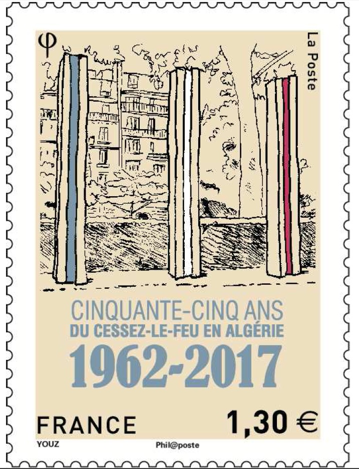 La Poste émet un timbre à l’occasion des 55 ans du cessez-le-feu en Algérie. Le timbre représente le Mémorial National de la Guerre d’Algérie et des combats du Maroc et de la Tunisie conçu par Gérard Collin-Thiébaut et inauguré le 5 décembre 2002.
