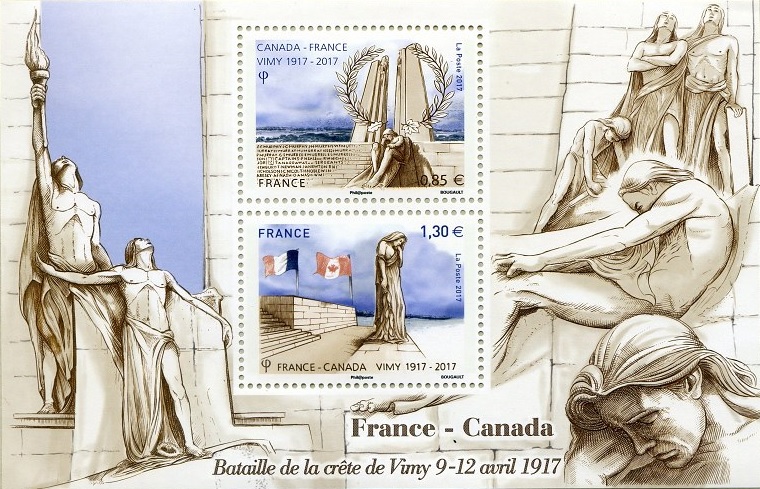 La France et le Canada commémorent le centième anniversaire de la bataille de la Crête de Vimy, avec une émission commune aux deux pays d’un bloc de deux timbres commémoratifs.