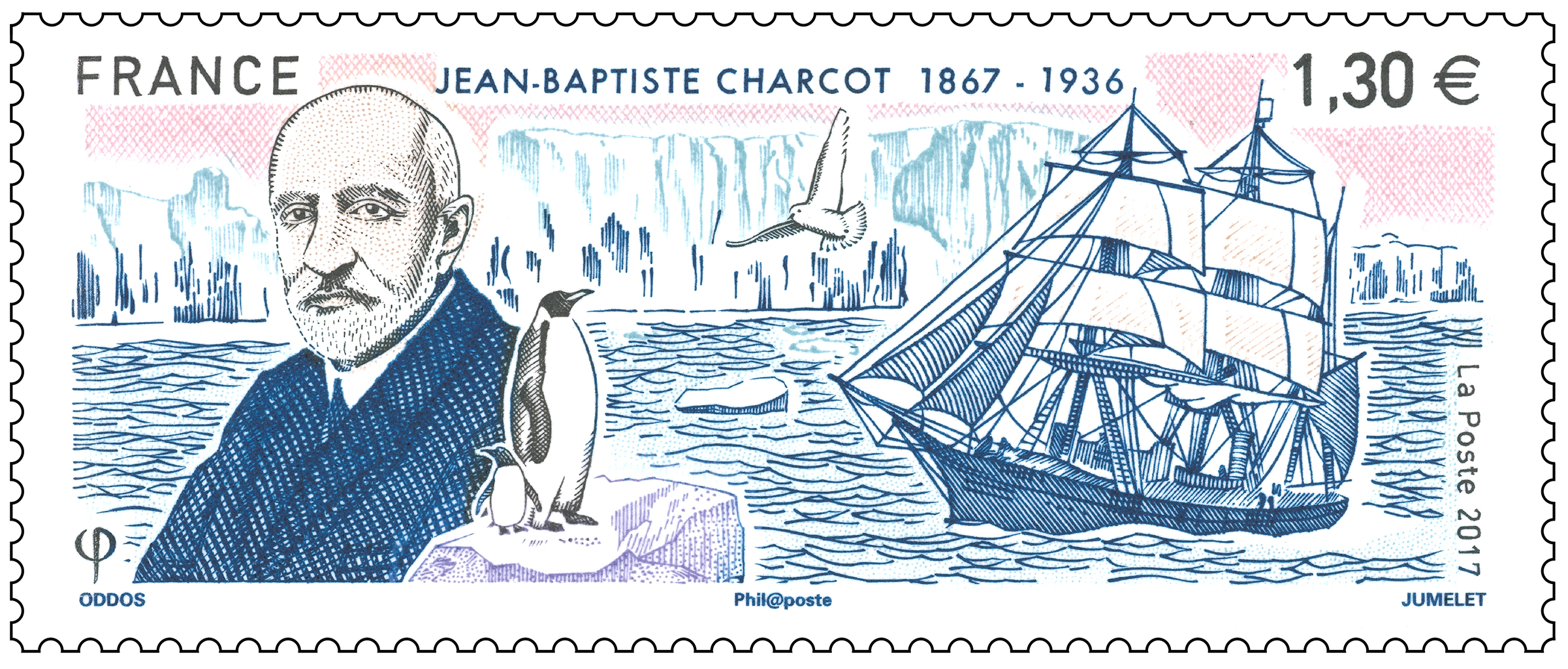 La Poste émet un timbre à l’occasion du 150ème anniversaire de la naissance de Jean-Baptiste Charcot. Le timbre représente Jean-Baptiste Charcot dans son univers, les régions polaires, les manchots, son navire le Pourquoi-Pas ? et la mouette Rita sa mascotte.