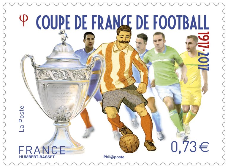 Pour célébrer le centenaire de la plus ancienne compétition de football française, La Poste émet un timbre dont le visuel évoque une équipe composée de footballeurs anciens et actuels aux couleurs des grands clubs qui ont marqué la Coupe de France, tels que Marseille, Lille, Saint Etienne, Paris, Nantes. Au premier plan, le trophée Charles Simon symbolise le centenaire de la Coupe de France de Football.