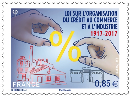 La Poste émet un timbre à l’occasion du centenaire de la Loi sur l’organisation du crédit au commerce et à l’industrie.