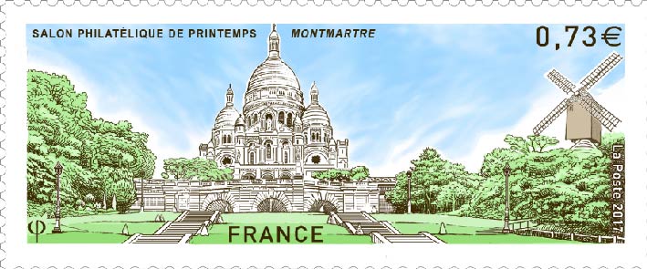 C’est la première fois que la basilique du Sacré Coeur est représentée en premier plan sur un timbre gravé. La blancheur de la basilique ressort dans son écrin de verdure avec en fond un ciel de printemps parisien, à droite le moulin de la Galette.