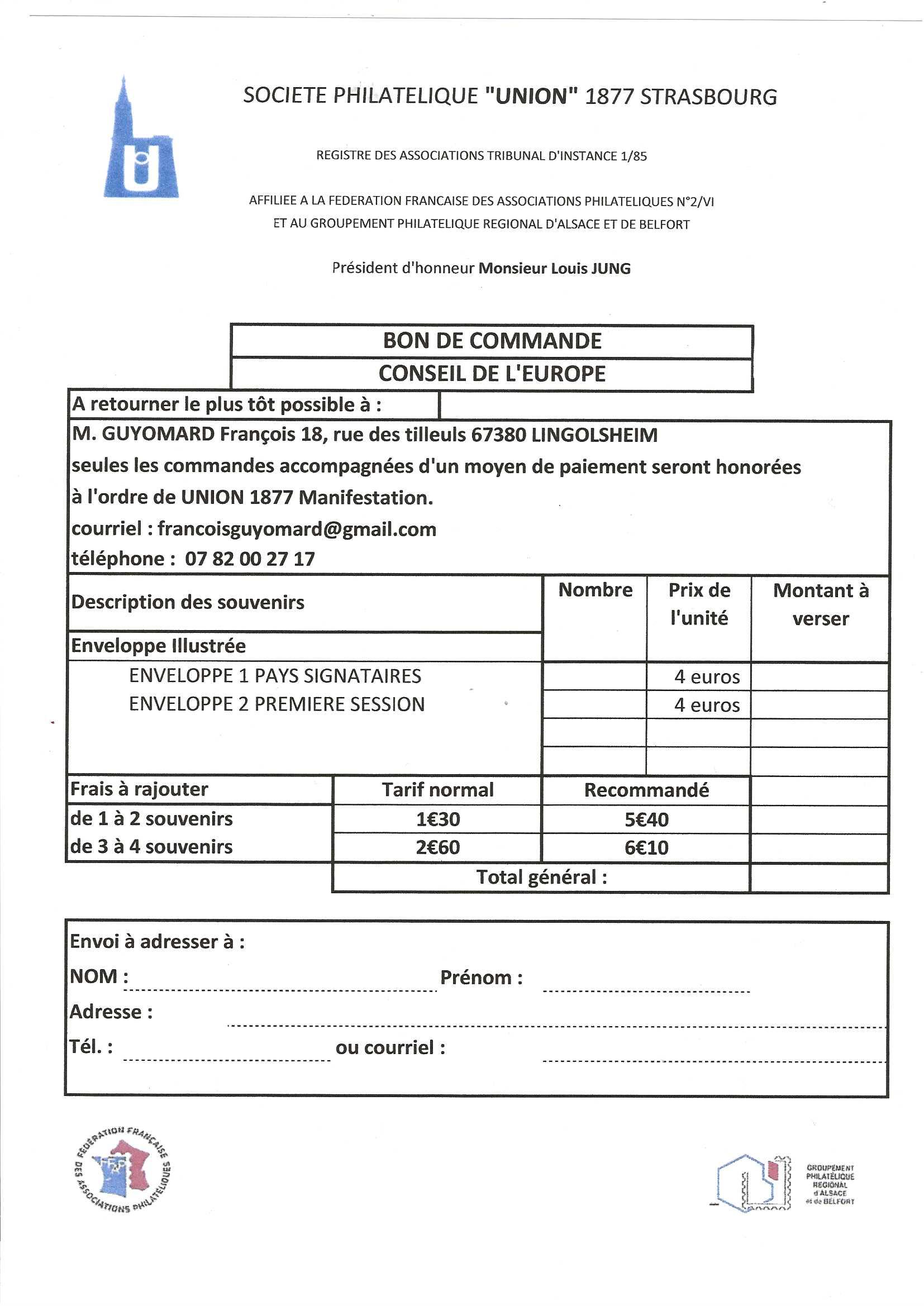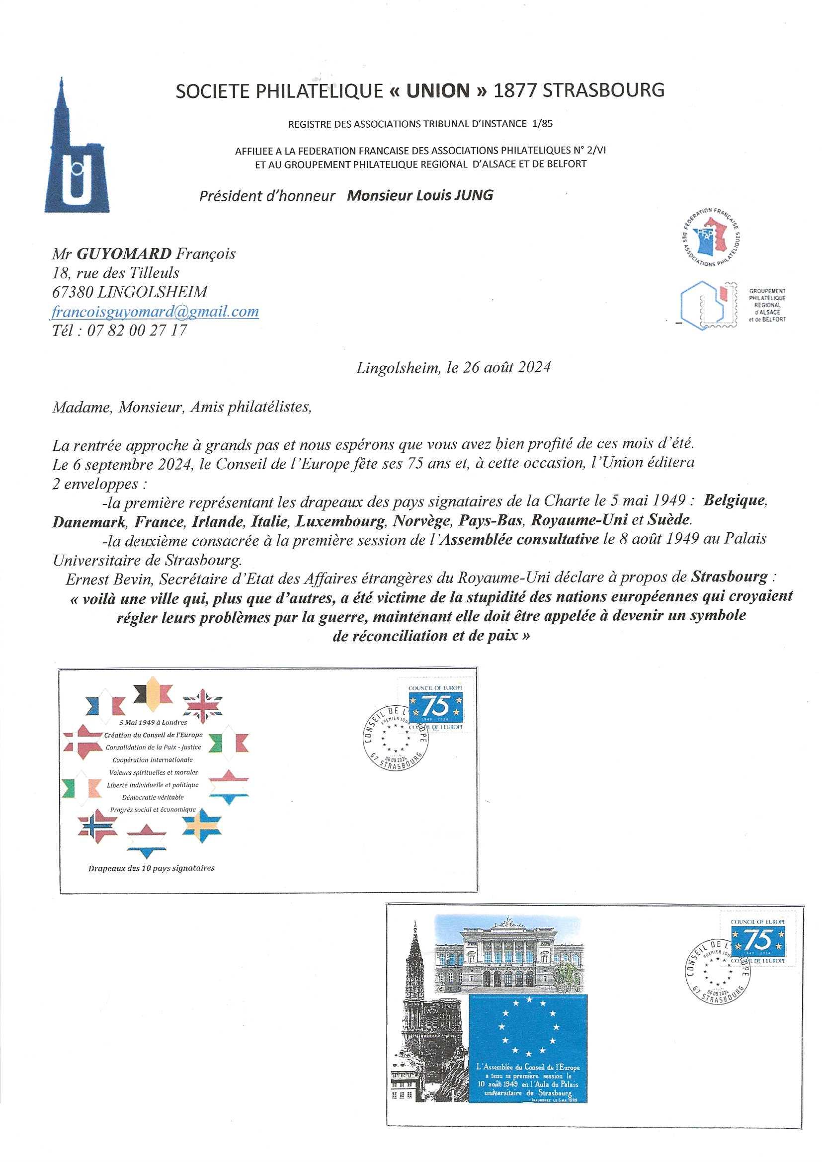 A l’occasion des 75 ans du Conseil de l’Europe, la Société philatélique Union 1877 édite deux enveloppes souvenirs dont les visuels et le bon de commande sont présents en fichiers joints.