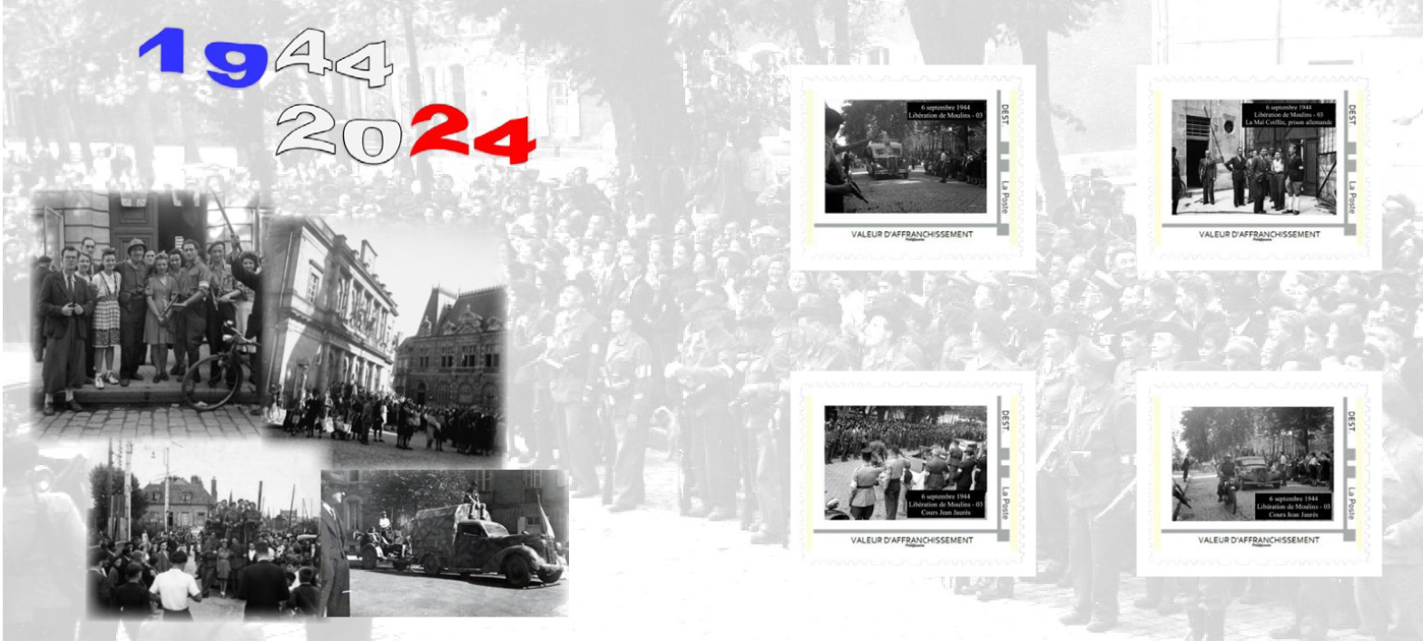L’A.P.M. proposera cinq timbres personnalisés reprenant cinq photos qui ont immortalisé les journées de la Libération ; un timbre sera vendu à partir de feuilles imprimées, quatre autres illustreront un « collector » spécial pour cet anniversaire. Une carte postale sera aussi mise en vente, illustrée par une photographie prise à l’époque devant la Préfecture de l’Allier. Elle sera revêtue du timbre de feuille et oblitérée par un Timbre à Date événementiel (cachet postal) représentant le monument créé par Juan PALAU. Tout ceci avec le concours de la Poste.
