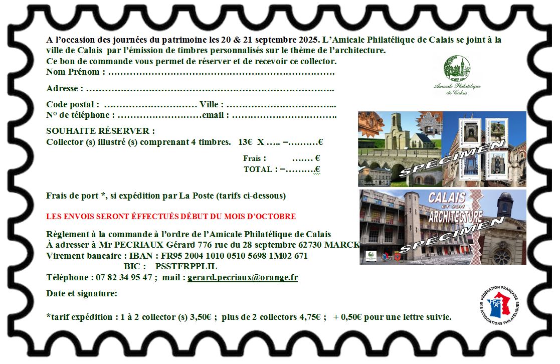A l’occasion des journées du patrimoine les 20 et 21 septembre 2025, l’Amicale Philatélique de Calais se joint à la ville de Calais par l’émission de timbres personnalisés sur le thème de l’architecture.