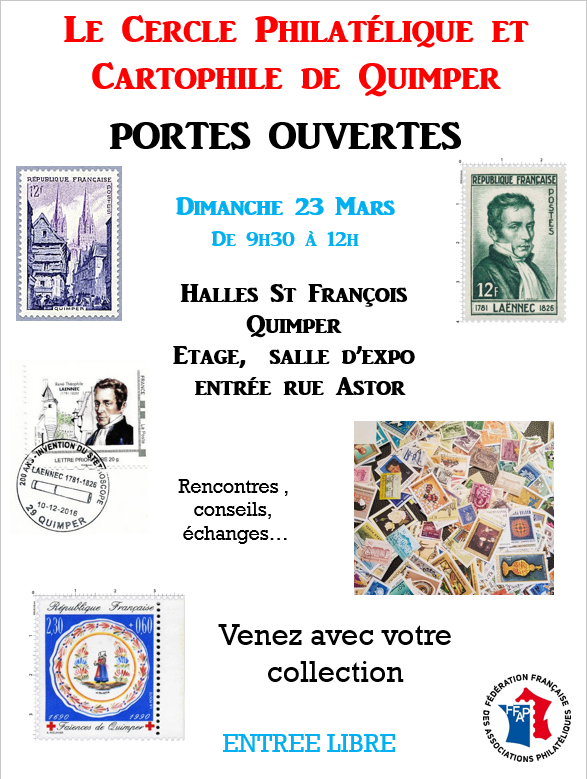 Le Cercle Philatélique et Cartophile de Cornouaille, de Quimper organise une opération portes ouvertes de 9h30 à 12h pour faire découvrir son association, en haut des halles St François, salle d’exposition Quimper, entrée rue Astor.