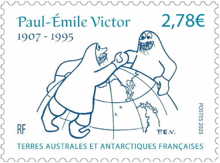 À l’occasion du Salon Philatélique d’Automne, les Terres Australes et Antarctiques Françaises, en partenariat avec la Fondation Paul-Émile Victor, dévoilent un nouveau timbre hors-programme en hommage à Paul-Émile Victor, figure emblématique de l’exploration polaire, disparu en 1995 ainsi qu’une série de timbres de petites valeurs à l’effigie de l’ancre TAAF.