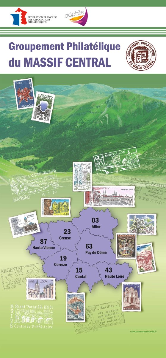 Le XXème Groupement philatélique regroupe sept départements soit deux anciennes régions administratives, l’Auvergne (Allier, Cantal, Haute Loire et Puy de Dôme) et le Limousin (Corrèze, Creuse et Haute Vienne), tous situés sur le bloc de granit du Massif Central sur lequel sommeillent des chaînes volcaniques d’époques plus ou moins lointaines.